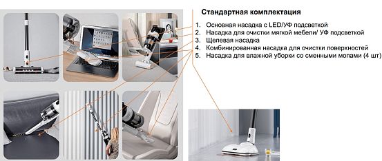 LED подсветка зоны уборкиестьВес, кг6.9ВидбеспроводнойВремя зарядки аккумулятора, ч5Гарантия, мес12Индикация уровня зарядаестьКоличество уровней мощности3Комплектациякомплект для мытья полов 3в1 основная насадка щелевая насадка щетка 2в1 щетка для матрасовМощность всасывания, кПа26Мощность, Вт350Тип фильтра2 x H13 HEPAУровень шума, дБ70ЦветбелыйЕдиница измеренияшт -