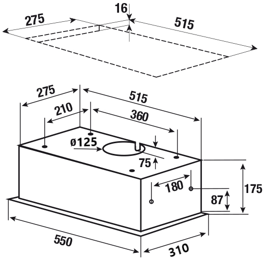 Высота (см)17.5Глубина (см)29Диаметр воздуховода (мм)125Длина сетевого кабеля (см)80Количество ламп1Количество моторов1Количество ступеней мощности3Мощность каждой лампы (Вт)5Мощность подключения (Вт)180Напряжение (В)220ОсвещениесветодиодноеПереключателикнопочныеПроизводительность max (м3/ч)303Размер (В х Ш х Г), см17.5 х 55 х 29Размеры ниши для встраивания (В х Ш х Г), см17.5 х 51.5 х 27.5Режимы работыотвод рециркуляцияСпособ монтажав шкафТип вытяжкивстраиваемаяУровень шума (дБ)69Цветнержавеющая стальЧастота (Гц)50Ширина (см)55Единица измеренияшт -