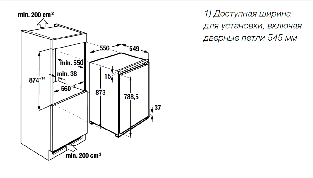 Вес (кг)40Вид встраиванияв колоннуВысота (см)87.3Глубина (см)54.9Из них переставляемых по высоте (шт.)3Кабель для подключения (м)1.75Класс энергопотребленияA++Климатический классSN - TКоличество дверей1Количество камер1Количество компрессоров1Количество полок из ударопрочного стекла (шт.)4Количество полок на двери (шт.)3Количество ящиков для овощей и фруктов (шт.)1Контуров охлаждения1Крепление фасадажесткоеМощность подключения (Вт)100Общий полезный объем (л)137Объем холодильного отделения (л)137Освещение в холодильной камереLEDПеренавешиваемая дверьестьРазмеры ниши для встраивания (В х Ш х Г), см88.4 х 56.8 х 55Ручкабез ручкиСила тока (А)10Система охлаждения в холодильном отделениикапельнаяСистема размораживания в холодильном отделенииавтоматическаяТип управленияэлектронноеУровень шума (дБ)33ЦветбелыйЧастота (Гц)50-60Ширина (см)55.6Энергопотребление (кВтч в год)95Единица измеренияшт -