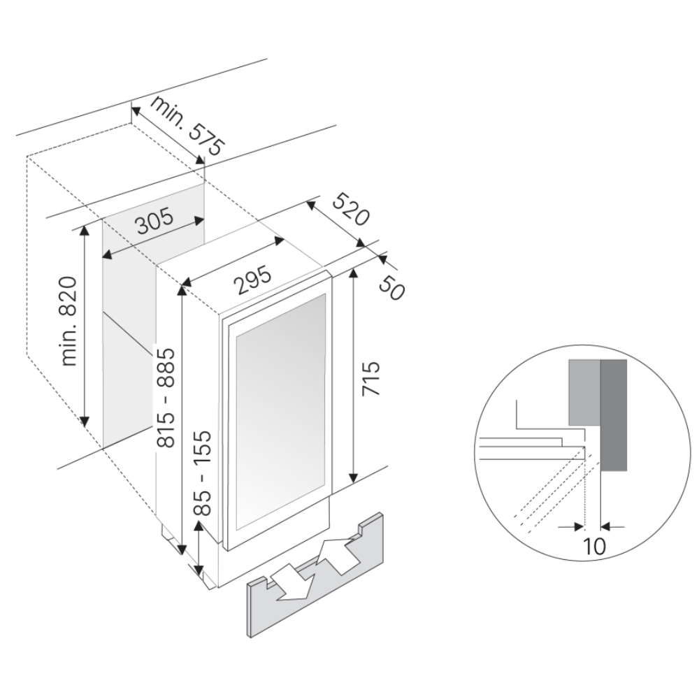 Вид встраиванияпод столешницуВместимость, бутылок вина17Высота (см)82-89Габариты (В х Ш х Г), см82-89 х 59.5 х 57Глубина (см)57Дверной упорсправаДиапазон температур в верхней секции, °C5-12Диапазон температур в нижней секции, °C12-20ДисплейцифровойКласс энергопотребленияAКлиматический классTКоличество дверей1Количество камер1Количество компрессоров1Количество полок5Контуров охлаждения2Материал полокдеревоНапряжение (В)220ОсвещениесветодиодноеОсобенности дверизащита от УФ лучей черное стеклоПеренавешиваемая дверьестьРегулировка температурыэлектронная с кнопкамиСигнализация неисправностейакустическаяСигнализация открытой дверцыакустическаяСила тока (А)10Уровень шума (дБ)38Цветчерное стеклоЧастота (Гц)50Ширина (см)29.5Ширина тумбы для встраивания (см)30Энергопотребление (кВтч в год)96Единица измеренияшт -